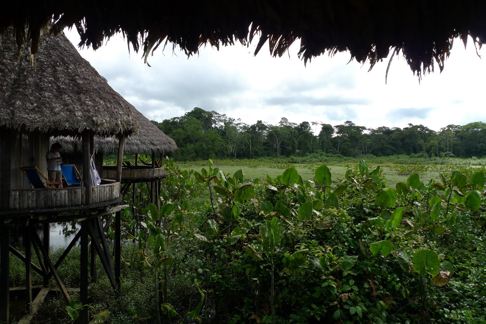 From there, we took a canoe ride of about an hour up the Pastaza to the Capahuara River, where the Kapawi Lodge is located. There are wooden boardwalks everywhere, and our rooms are individual huts on stilts that jut out overlooking a peaceful a lagoon. The boardwalk is wet and slick, and there's no way I'd touch the railings because some bug or another is hiding in every nook and cranny. Heck, some aren't even bothering to hide... This is not the place for the bug-phobic.