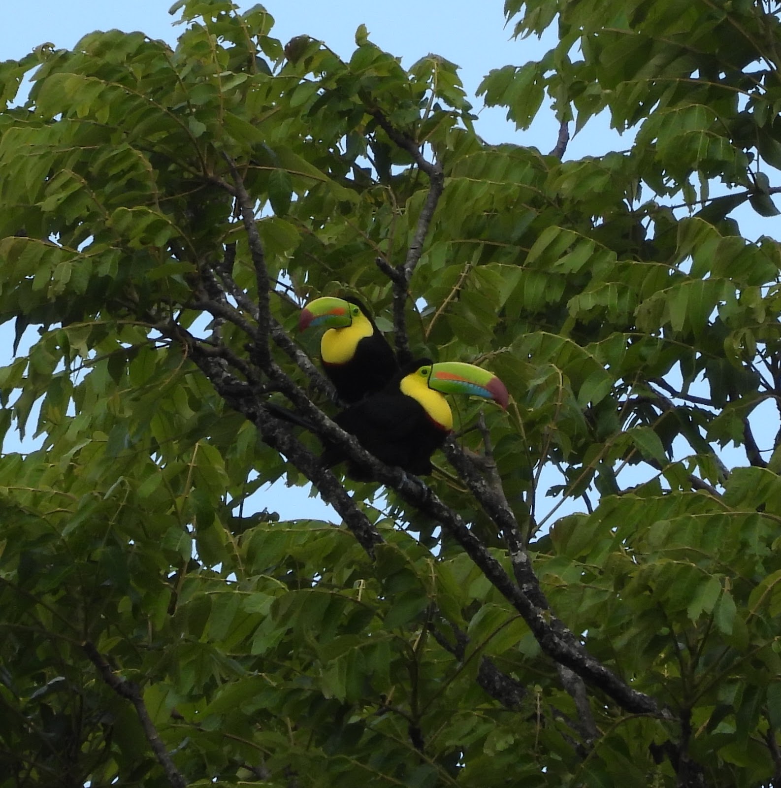 The male that we spotted was partially hidden behind some trees, but his twin tail feathers were easy to see (since they were almost three feet long and fluttering in the wind!) The female, which lacked the red highlights and long tailfeathers, was much easier to spot. It was a good time to see them since it was nesting season, and their favorite food is the wild avocado so they were in the same tree as the guan and the chlorophonia. Such a thrill to see them!